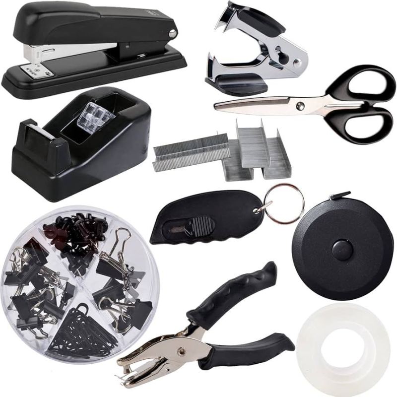 Engrapadoras, perforadoras, tijeras, clips, gomas, pegamentos, cintas adhesivas.